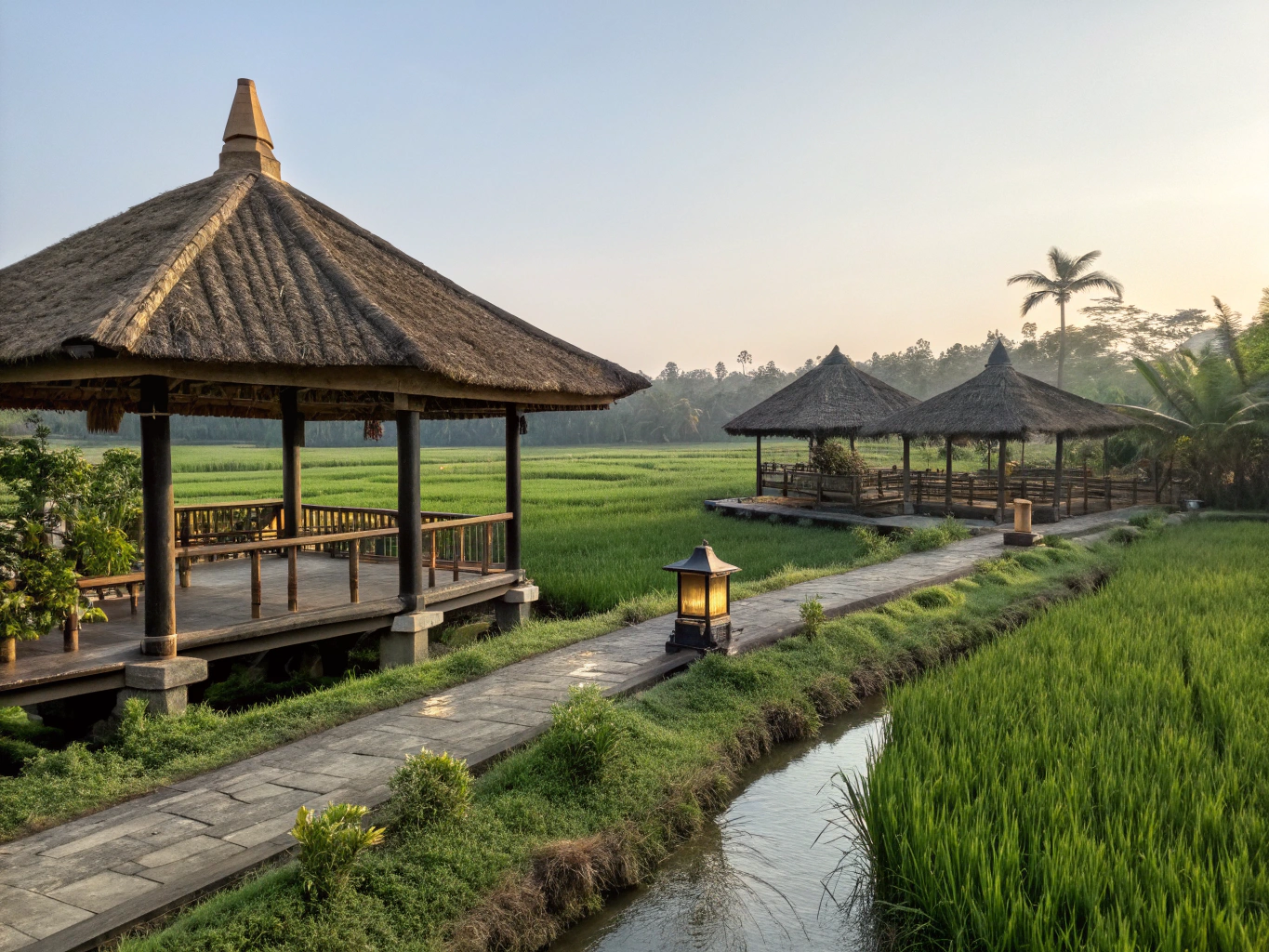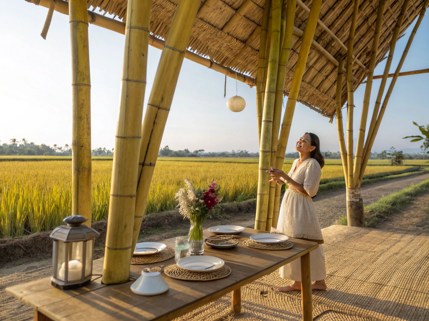 A stunning bamboo-crafted event space overlooking serene rice fields, perfect for weddings, celebrations, and corporate gatherings.